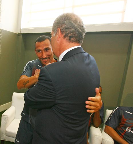 Guiñazu cumprimenta Giovanni Luigi na reapresentação dos jogadores do Inter